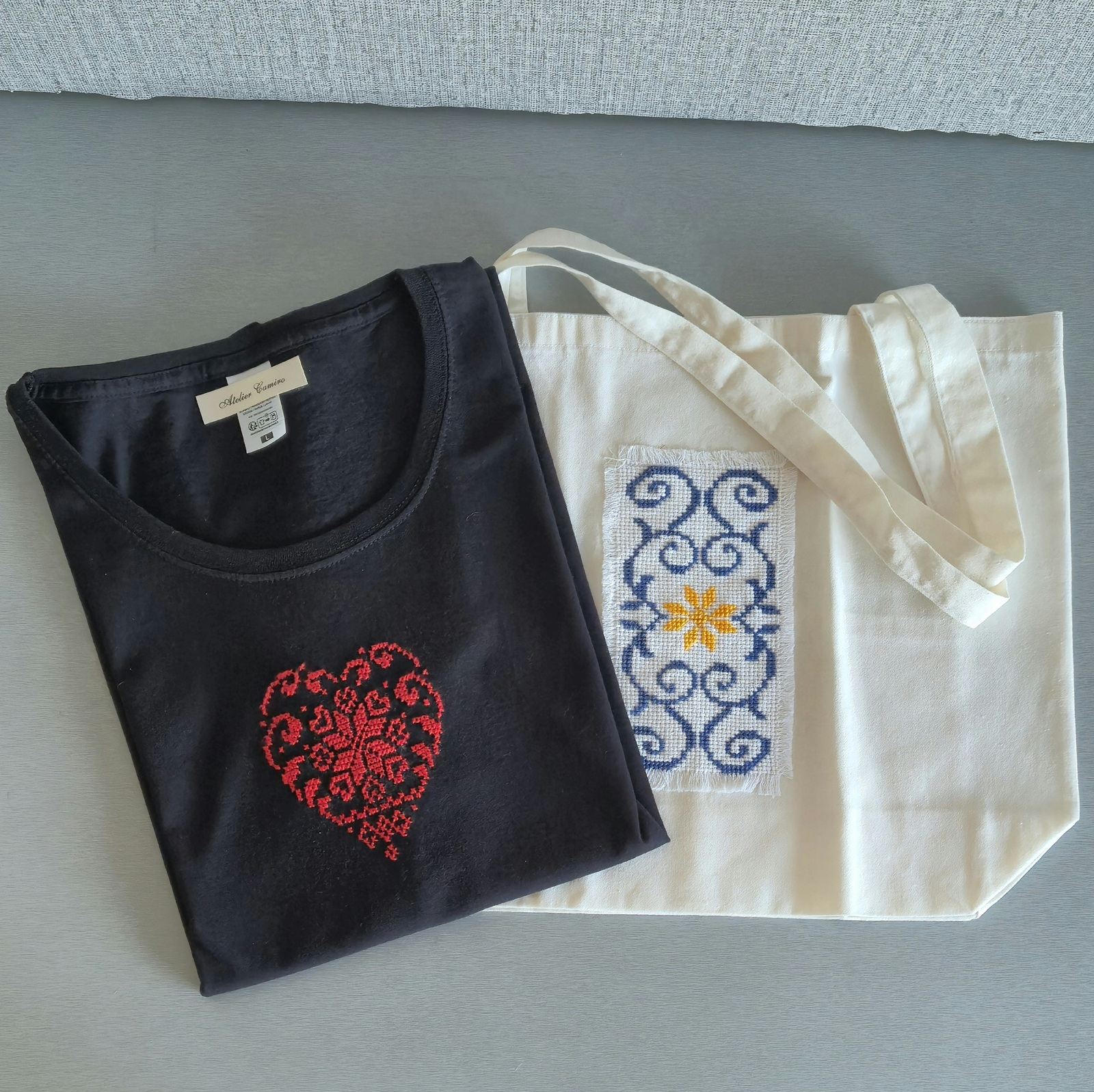 Tricou negru cu inimioara rosie, din bumbac 100%, si plasuta cu model albatsru inchis.